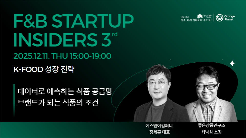 F&B 분야 스타트업을 위한 실전 교류 프로그램 ‘F&B STARTUP INSIDERS 3회차’가 오렌지파크에서 개최된다. 전북과 수도권의 F&B 스타트업이 모여 ‘팔리는 제품(Product)’과 ‘실행력(Execution)’에 대한 노하우를 배우고 실제 협업 기회를 모색하는 데 초점을 맞춘다,