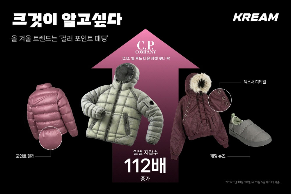 한정판 거래 플랫폼 크림이 빅데이터 분석을 통해 올겨울 패션 트렌드로 ‘컬러 포인트 패딩’을 제시했다. 11월 리포트에 따르면, 핑크·스카이블루·베이지 등 과감한 색감과 독특한 소재를 입은 패딩 거래량이 급증하며 무채색 위주의 트렌드에서 개성을 중시하는 방향으로 소비 심리가 변화하는 것으로 나타났다. 레드벨벳 슬기 착용 핑크 다운 등 일부 제품은 정가 대비 높은 프리미엄에 거래되었으며, C.P. 컴퍼니의 특정 제품은 저장수가 전년 대비 2,734% 폭증했다. 이러한 컬러 트렌드는 아우터를 넘어 패딩 슈즈 브랜드 ‘스부’의 인기를 견인하는 등 발끝까지 확장되고 있다. 크림 측은 “컬러와 텍스처가 강조된 제품에 주목할 때”라고 설명했다.