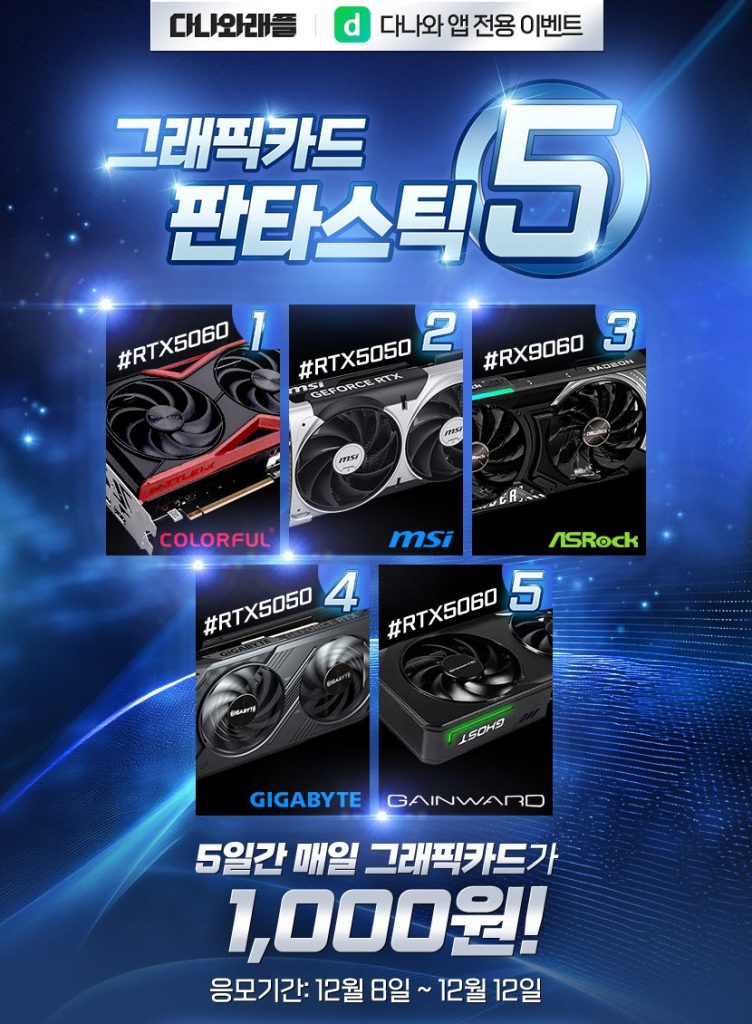 이커머스 전문기업 커넥트웨이브가 운영하는 가격비교 서비스 다나와가 연말을 맞아 최신형 그래픽카드를 단돈 1천 원에 구매할 수 있는 ‘연말 결산 다나와 래플’ 이벤트를 오는 12일까지 5일간 진행한다. 고물가로 PC 부품 구매를 미뤄왔던 소비자들을 위해 기획된 이번 행사는 RTX 5060, RTX 9060 등 게이머 선호도가 높은 고성능 그래픽카드를 매일 1명에게 득템할 기회를 제공한다. 참여는 다나와 앱에서만 가능하며, 당첨되지 않을 경우 결제한 1천 원이 전액 자동 환불되는 ‘제로 리스크’ 방식을 채택했다. 또한, 5일간 모든 래플에 참여한 고객 중 100명에게는 추첨을 통해 편의점 상품권을 증정하는 ‘개근상’ 혜택도 마련됐다. 최종 당첨자는 16일 다나와 게시판을 통해 발표될 예정이다.
