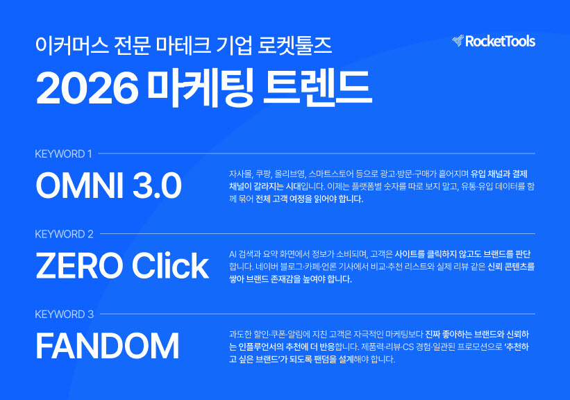 이커머스 마테크 기업 로켓툴즈가 2026년 마케팅 트렌드 키워드로 ‘옴니채널 3.0’, ‘제로클릭’, ‘팬덤’을 제시했다. 단순 노출 경쟁을 넘어 고객의 입체적인 데이터를 확보하고 팬덤을 구축해야 브랜드 성장이 가능하다는 분석이다. 로켓툴즈는 유입 채널과 결제 채널이 엇갈리는 ‘옴니채널 3.0’ 시대에는 전체 고객 여정을 해석하는 시각이 중요하다고 강조했다. 또한 AI 검색으로 직접 클릭 없이 정보를 얻는 ‘제로클릭’ 환경에 대비해 AI가 인용할 수 있는 콘텐츠 인프라를 외부 채널에 축적해야 한다고 조언했다. 마지막으로, 과도한 마케팅 대신 제품력과 진솔한 리뷰, 긍정적 CS 경험 등을 통해 소비자를 브랜드 지지자로 만드는 ‘팬덤 마케팅’의 중요성을 역설했다.