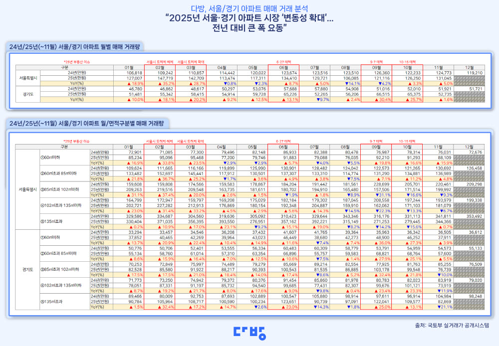 2025년 서울과 경기 아파트 시장은 정부 정책 발표에 따라 거래량이 큰 폭으로 요동치며 변동성이 확대됐다. 다방이 국토부 실거래가를 기반으로 집계한 자료에 따르면, 올해 1~11월 서울 아파트 거래량은 13만여 건, 경기 아파트는 25만여 건으로 나타났다. 서울은 토지거래허가제 해제와 대출 규제, 공급 확대 등 정책 발표 시점마다 거래량이 급등락을 반복했다. 특히 9월에는 공급 확대 방안 발표로 거래량이 전년 대비 180% 이상 증가했으나, 10월 투기과열지구 확대 지정 이후 11월에는 다시 30% 가까이 감소했다. 반면 경기도는 11월 거래량이 오히려 40% 가까이 늘며 서울과 상반된 흐름을 보였다. 평균 매매가는 서울이 13억 원대로 전년 대비 5% 상승했고, 경기는 5억 원대 초반으로 1.6% 오르는 데 그쳤다. 면적별로는 서울은 국민평수 구간에서 하락폭이 컸고, 경기는 소형 평수에서 상승세가 두드러졌다. 시장은 정책 변화와 대출 부담에 따라 수도권 외곽으로 수요가 이동하는 양상이 뚜렷하게 나타나고 있다.