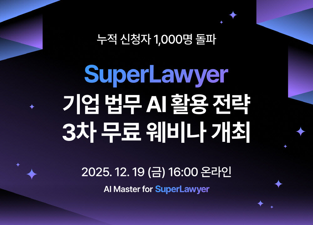 종합 리걸테크 기업 로앤컴퍼니가 올해 마지막 법률 AI 웨비나인 ‘2025 제3차 슈퍼로이어 마스터 클래스’를 12월 19일 오후 4시에 무료로 개최한다. 누적 신청자 1천 명을 돌파한 하반기 강좌의 연장선으로, 이번 3차 웨비나에서는 ‘기업 법무’를 주제로 변호사 출신인 김동욱 SaaS 사업팀장이 연사로 나선다. 강연에서는 슈퍼로이어를 활용한 자문, 계약, 컴플라이언스 업무의 효율적 노하우를 공개할 예정이다. 법률 전문가라면 슈퍼로이어 회원 여부와 관계없이 누구나 18일까지 신청할 수 있다. 한편, 로앤컴퍼니의 슈퍼로이어는 국내 전체 변호사의 약 50%에 달하는 1만 9천여 명의 가입자를 확보하며 국내 법률 AI 시장을 선도하고 있다.