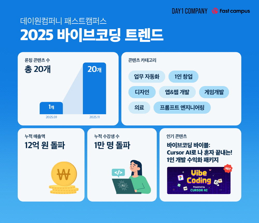 데이원컴퍼니의 패스트캠퍼스가 ‘2025 바이브코딩 트렌드’와 주요 성과를 발표했다. 바이브코딩은 복잡한 프로그래밍 지식 없이 자연어로 AI에 명령하여 웹사이트, 자동화 등을 구현하는 새로운 코딩 방식으로, 개발 진입 장벽을 낮추며 1인 창업자, 기획자 등 다양한 직군의 ‘보편적 생산성 도구’로 빠르게 확산 중이다. 패스트캠퍼스는 관련 교육 콘텐츠를 공격적으로 확장, 론칭 1년 만에 누적 매출 12억 원, 수강생 1만 명을 돌파하며 AI 코딩 교육 시장을 주도했다. 특히 최근에는 비전공자 대상 패키지부터 직장인 업무 자동화, 의료 데이터 분석 등 직무별 실무형 커리큘럼으로 무게 중심을 옮기며 활용 영역을 넓히고 있다.