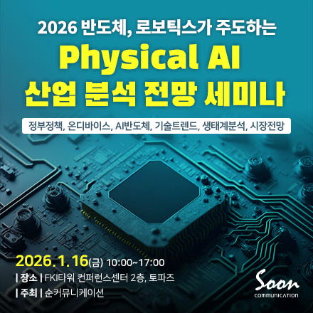 순커뮤니케이션이 2026년 첫 행사로 1월 16일 서울 여의도 FKI타워에서 ‘반도체·로보틱스가 주도하는 Physical AI 산업 분석 전망 세미나’를 연다. 이번 세미나는 AI 반도체와 로보틱스 산업의 국내외 시장 분석, 고급 배터리 기술과 로봇 발전, 모빌리티 산업 패권 경쟁, 온디바이스 사족 로봇 적용 사례, 국내 휴머노이드 개발 동향 등 다양한 주제를 다룬다. Physical AI는 언어·행동·시각을 통합해 로봇이 카메라와 센서를 통해 인식하고 물리적 동작을 수행하는 기술로, 자율주행차와 휴머노이드 로봇 등 다양한 분야에 적용된다. 정부의 AI 대전환 비전과 맞물려 고성능 AI 반도체 수요가 급증하며 시장이 활기를 띠고 있다. 이번 세미나는 ‘로보틱스와 AI의 결합이 산업 지도를 바꾼다’라는 주제로 국내 기업들의 기술 발표와 산업 전망을 공유하는 자리로, 발표자와의 질의응답을 통해 참가자들이 최신 흐름을 직접 확인할 수 있는 기회가 될 예정이다.