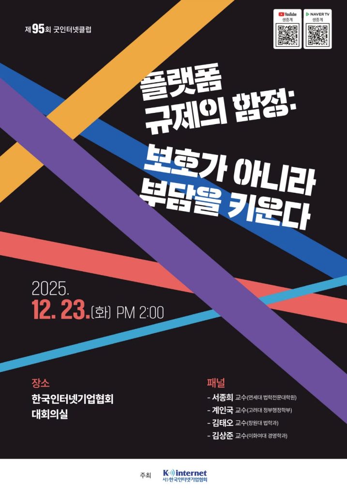 한국인터넷기업협회(인기협)는 오는 23일 오후 2시 협회 대회의실에서 ‘플랫폼 규제의 함정: 보호가 아니라 부담을 키운다’를 주제로 제95회 굿인터넷클럽을 개최한다고 밝혔다. 최근 국제 통상 마찰 가능성 등으로 속도 조절론이 제기됐으나 다시 논의가 재개된 ‘온라인 플랫폼 중개거래의 공정화에 관한 법률안(온라인플랫폼법 단일안)’을 중심으로 논의가 진행될 예정이다. 인기협은 이번 좌담회를 통해 해당 법안이 국내 산업 전반에 미칠 파급효과와 주요 쟁점 조항들을 체계적으로 논의하고 점검할 계획이다. 좌담회 사회는 서종희 연세대학교 법학전문대학원 교수가 맡으며, 계인국 고려대 교수, 김태오 창원대 교수, 김상준 이화여대 교수가 패널로 참여한다. 행사는 인기협 네이버TV와 유튜브 채널을 통해 실시간으로 생중계된다.