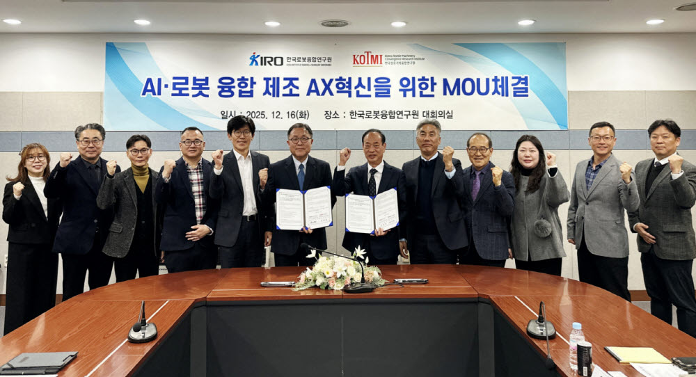 한국로봇융합연구원(KIRO)과 한국섬유기계융합연구원(KOTMI)이 AI·로봇 융합 기반의 제조 AX(AI Transformation) 혁신을 위한 상호 업무협약(MOU)을 체결했다. 양 기관은 12월 16일 협약을 맺고 AI·로봇 융합 제조기술 공동 개발, 연구 역량 및 인프라 연계, 정부·지자체·산업체와의 공동연구과제 발굴 및 사업화 기반 마련 등에 뜻을 모았다. 주요 협력 분야는 AI·로봇 융합 제조 AX혁신 기술개발 협력, 공동연구과제 공동 추진, 전문인력·기술·장비·정보 상호교류, 산·학·연 네트워크 공동 운영 등이다. 이번 협약은 제조현장 고도화 수요에 대응하여 공정 지능화, 품질 고도화, 생산성 향상 등 지역 및 산업계가 체감할 수 있는 실질적인 성과를 창출할 것으로 기대된다.