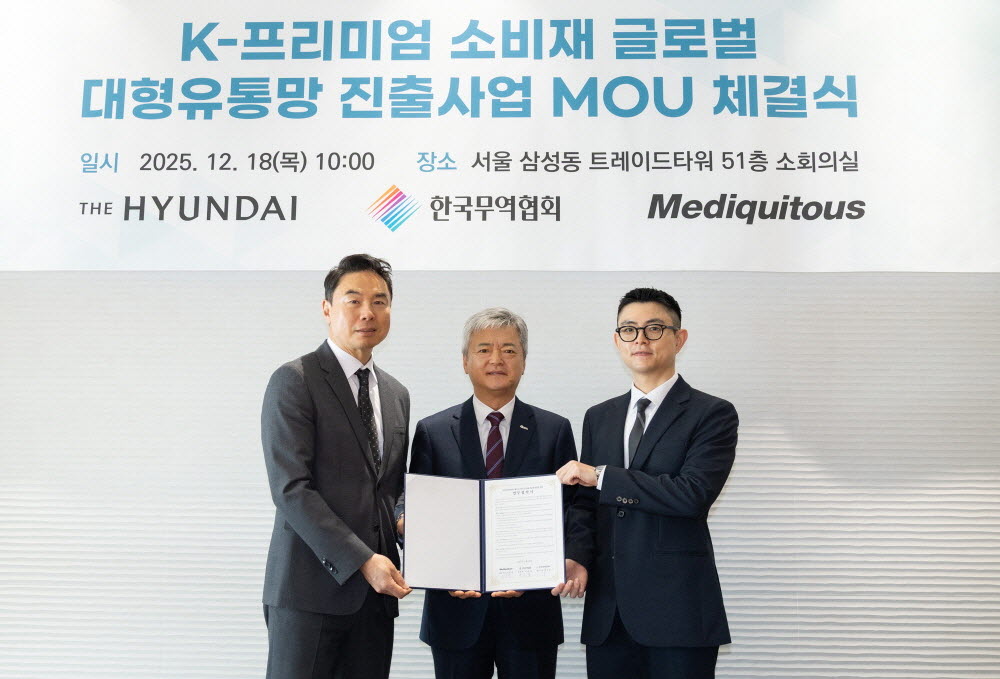 한국무역협회(KITA)는 18일 현대백화점, 메디쿼터스와 ‘K-프리미엄 소비재 글로벌 대형유통망 진출사업’ 추진을 위한 3자 업무협약을 체결했다. 이번 협약은 K-컬처 열풍에 발맞춰 패션, 뷰티 등 한류 연관 소비재의 수출 확대를 지원하는 것이 목표다. 3사는 일본, 대만 등 해외 대형 쇼핑몰에 팝업 형태의 ‘K-프리미엄 스토어’를 조성해 국내 소비재 기업 40여 개사의 해외 입점을 돕는다. 사업은 대·중·소 상생 차원에서 2026년 3월부터 10개월간 해외 5개 쇼핑몰에서 운영될 예정이다. 무역협회(모집/지원), 현대백화점(유통망 협업), 메디쿼터스(현지 운영)가 역할을 분담한다. 참가 기업 모집은 22일부터 무역협회 홈페이지를 통해 진행된다.