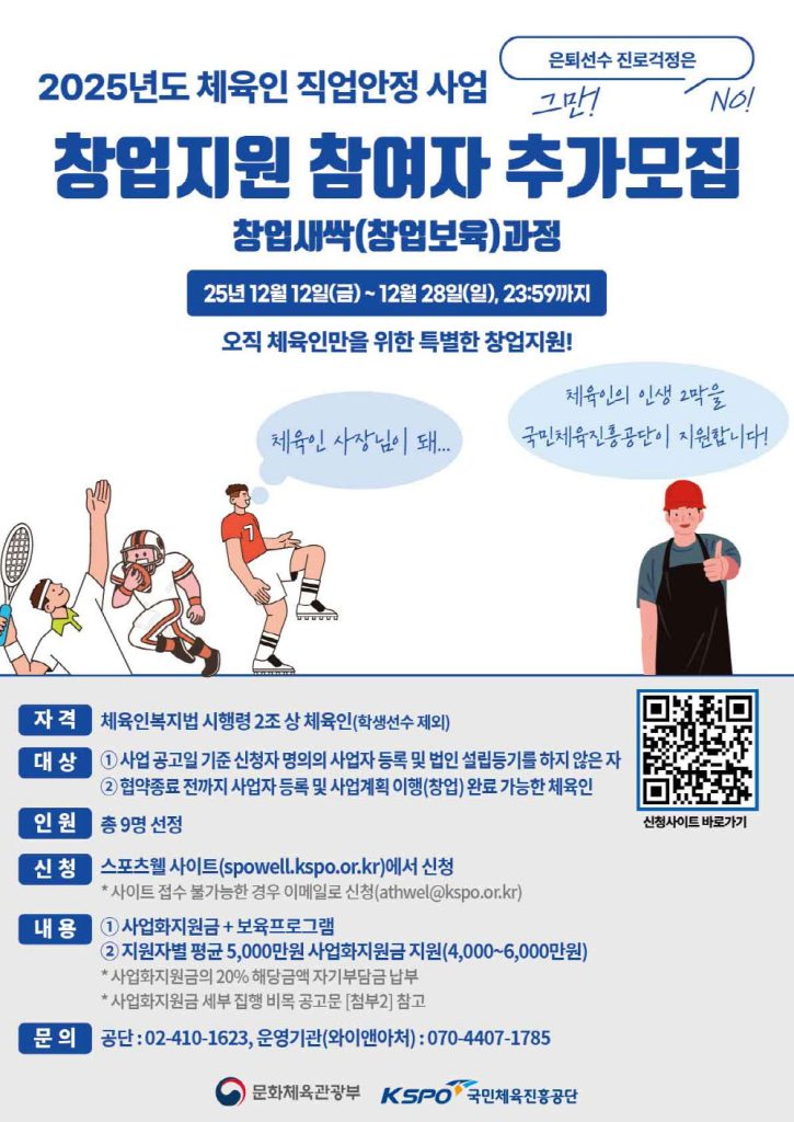 국민체육진흥공단이 2025년 체육인 직업안정 사업의 창업보육과정인 ‘새싹과정’ 참여자를 추가 모집한다. 모집 기간은 12월 12일부터 28일까지이며, 체육인복지지원포털을 통해 신청할 수 있다. 체육인 인증 절차가 필수로 요구되며, 인증 지연 시 이메일 접수도 가능하다. 신청 자격은 체육인복지법 시행령에 따른 체육인으로, 사업자 등록이나 법인 설립을 하지 않은 상태여야 하며 협약 종료 전까지 사업계획을 이행할 수 있어야 한다. 단, 타 정부 창업지원사업과 중복 참여하거나 제재 조치를 받은 경우는 지원이 불가하다. 이번 과정은 체육인의 창업 역량을 키우고 안정적인 직업 전환을 돕기 위한 프로그램으로, 사업자 등록과 사업화 지원을 연계해 실질적 성과를 목표로 한다. 공단은 이번 추가 모집을 통해 더 많은 체육인에게 창업 기회를 제공하고, 스포츠 인재의 경제적 자립을 지원할 계획이다.