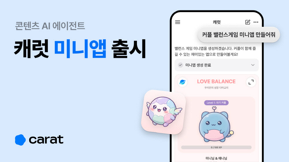 생성형 AI 플랫폼 캐럿(Carat)이 개발 지식이 없는 일반 사용자도 대화만으로 웹 애플리케이션을 제작할 수 있는 ‘AI 미니앱 생성 기능’을 22일 발표했다. 캐럿 에이전트와의 대화를 통해 기획부터 디자인, 개발까지 전 과정을 AI가 수행하며, 외국어 단어장 앱이나 밸런스게임 등 다양한 형태의 앱 제작이 가능하다. 특히 이미지, 영상, 음악 생성 등 캐럿이 보유한 멀티미디어 AI 도구를 통합적으로 활용해 완성도를 높였다. 캐럿은 이 AI 에이전트 서비스로 출시 5개월 만에 연간 반복 매출(ARR) 100만 달러를 달성하며 가파른 성장세를 보이고 있다. 장진욱 캐럿 대표는 “누구나 아이디어만 있다면 AI와 함께 자신만의 콘텐츠를 만들 수 있도록 돕는 것이 지향점”이라고 밝혔다.