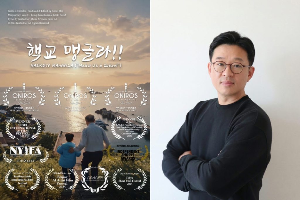 패션업에서 AI 크리에이터로 전향한 허준호 감독이 활동 3개월 만에 국제 영화제를 휩쓸며 세계적인 주목을 받고 있다. 완도 섬마을 다문화 가정의 학교 설립 이야기를 다룬 작품 <학교 맹글라>는 ‘2025 서울 국제 AI 영화제 대상’을 비롯해 뉴욕 오니로스 필름 어워즈 3개 부문 석권 등 화려한 수상 실적을 기록했다. 이 같은 성과에 힘입어 허 감독은 글로벌 영화 데이터베이스인 IMDb에 공식 감독으로 등재되는 쾌거를 이루었다. 그는 5초 분량의 영상 하나를 위해 1,000~2,000개의 결과물을 생성하고 선별하는 치밀한 작업 방식을 공개했다. 허 감독은 AI가 99개를 만들어줘도 ‘관객의 마음을 울리는 1개’를 선택하는 것은 결국 인간의 몫이라며 기술보다 인문학적 통찰과 서사의 중요성을 강조하고, 현재 에미상 노미네이트 경력 감독과 장편 AI 다큐멘터리를 제작 중이다.