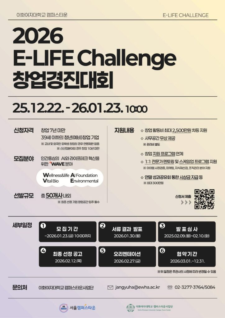 이화여대 캠퍼스타운이 2026년 ‘E-LIFE Challenge 창업경진대회’ 참가팀을 모집한다. 접수 기간은 2025년 12월 22일부터 2026년 1월 19일 오후 3시까지이며, 창업 7년 미만 기업과 만 39세 이하 청년 창업자가 주요 대상이다. 교내창업자와 외국인 유학생은 나이 제한이 없고, 제대군인은 복무 기간에 따라 연령 상한이 완화된다. 모집 분야는 인간 중심 AI와 라이프테크 혁신을 목표로 한 WAVE 분야로, 웰니스·AI·바이오·환경 등 신산업 영역을 포괄한다. 총 50개 팀 내외를 선발하며, 이 중 예비창업자 5개 팀이 포함된다. 선정 기업은 독립·공용 사무공간을 무상 제공받고, 최대 2,500만 원의 창업활동비, 1:1 멘토링, 스케일업 프로그램, 교육·세미나 등 다양한 지원을 받는다. 연말 성과공유회에서는 최대 300만 원의 시상금도 지급된다. 서류 발표는 2026년 1월 26일, 발표 심사는 2월 5~6일 진행되며 최종 결과는 2월 12일 공개된다. 협약 기간은 3월 1일부터 연말까지다. 단, 타 대학 캠퍼스타운과 중복 입주는 불가하며, 협약 이후 폐업·양도 시 지원금 전액 환수 등 엄격한 관리 기준이 적용된다. 신청은 구글폼을 통해 사업계획서와 증빙서류를 제출하는 방식으로 진행된다.