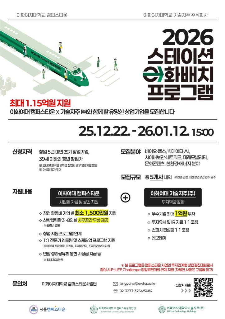 이화여대 캠퍼스타운이 유망 스타트업을 선발해 집중 육성하는 ‘2026 스테이션 이화 배치 프로그램’ 참가기업 모집을 시작했다. 접수 기간은 2025년 12월 22일부터 2026년 1월 12일 오후 3시까지이며, 창업 5년 미만 기업과 만 39세 이하 청년 창업자가 주요 대상이다. 교내창업자와 외국인 유학생은 연령 제한이 없고, 제대군인은 복무 기간에 따라 상한 연령이 완화된다. 모집 분야는 바이오·헬스, 빅데이터·AI, 사이버보안, 미래모빌리티, 문화콘텐츠, 친환경·에너지 등 6개 분야이며, 총 5개 기업을 선발한다. 선정 기업은 독립 또는 공용 사무공간을 무상 제공받고, 최대 1억 원의 기술지주 투자 검토, 기업당 1,500만 원의 창업활동비, 1:1 멘토링, 스케일업 프로그램, 글로벌 진출 교육, IR·스피치 코칭, 데모데이 참여 등 다양한 지원을 받는다. 서류 결과는 2026년 1월 16일 발표되며, 발표 심사는 1월 29일 이화여대에서 진행된다. 최종 선정 기업은 1월 30일 공개되고, 3월 1일부터 연말까지 협약 기간이 적용된다. 탈락 기업은 E-LIFE Challenge 창업경진대회로 자동 연계되거나 서류 면제 혜택을 받을 수 있다. 중복 입주 제한, 주소지 이전 의무, 폐업 시 지원금 환수 등 엄격한 운영 기준이 적용되며, 신청은 구글폼을 통해 사업계획서와 증빙서류를 제출하는 방식으로 진행된다.