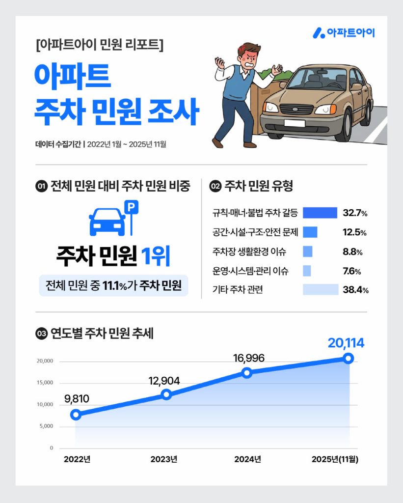 아파트 생활 지원 플랫폼 아파트아이가 2022년 1월부터 2025년 11월까지 공동주택 민원 데이터를 분석한 결과, ‘주차’ 관련 민원이 4년 연속 민원 건수 1위를 차지한 것으로 나타났다. 전체 공동주택 민원 약 55만 건 중 약 11%를 차지하는 주차 민원은 2022년 대비 2025년에 2배 이상 증가했으며, 매년 30%가 넘는 증가세를 보였다. 특히 주차 민원의 55%가 2회 이상 반복되는 반복 민원이었고, 유형 중에서는 주차 매너 및 불법주차 관련 민원이 약 33%로 가장 높은 비중을 차지했다. 아파트아이 측은 주차 갈등을 줄이기 위해 상시적인 주차 관리 체계 강화가 중요하다고 강조했다.