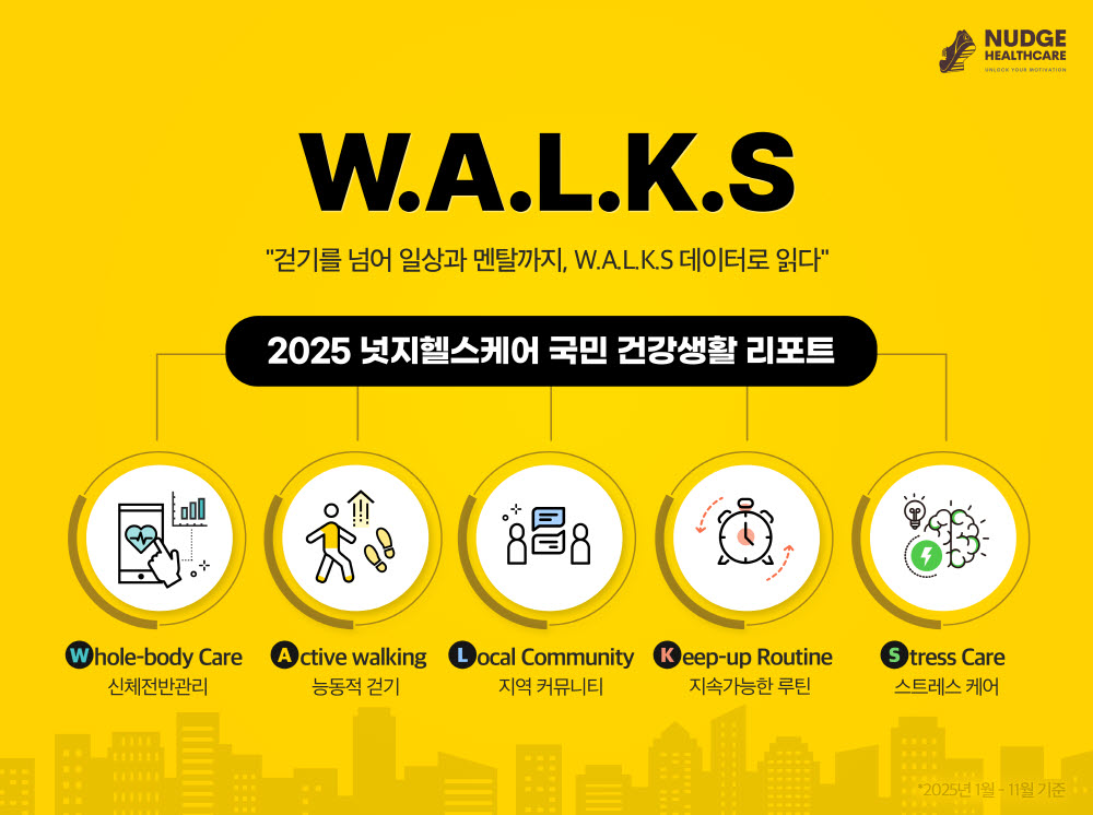 넛지헬스케어㈜가 자사 플랫폼에 축적된 건강 행동 데이터를 분석한 ‘2025 국민 건강생활 리포트’를 공개하며 일상 속 건강관리 트렌드를 조명했다. 캐시워크, 지니어트 등 주요 서비스 이용자들의 실제 행동 데이터를 기반으로 신체 전반 관리, 능동적 걷기, 지역 커뮤니티, 지속 가능한 루틴, 스트레스 케어 등 5가지 핵심 지표를 ‘W.A.L.K.S’ 키워드로 도출했다. 특히 캐시워크 이용자들이 한 해 동안 누적 3,793억 kcal를 소모하며 걷기 운동의 활성화를 입증했으며, 60·70대 시니어 세대의 적극적인 참여가 두드러졌다. 이 리포트는 건강 관리가 더 이상 특별한 목표가 아닌 ‘일상 속 반복되는 행동’으로 자리 잡았음을 시사했다.