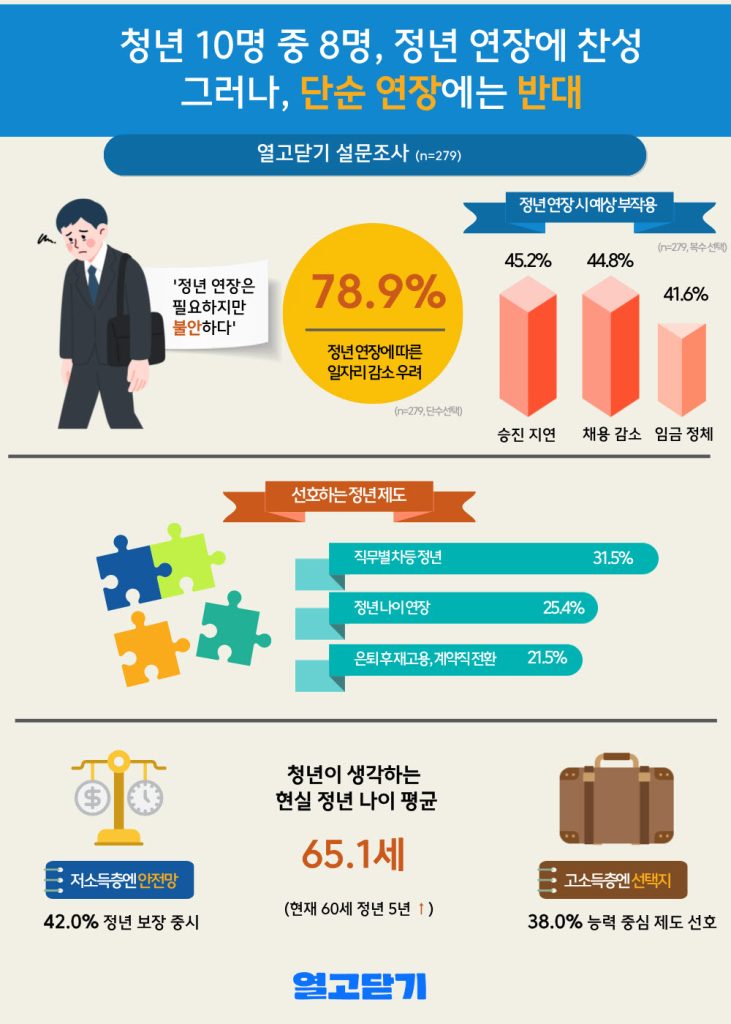 청년 정책·정보 플랫폼 ‘열고닫기’가 청년 279명을 대상으로 실시한 정년 연장 인식 조사 결과, 응답자의 81%가 정년 연장에 찬성하는 것으로 나타났다. 이는 기존의 세대 갈등 프레임과는 상반된 결과다. 그러나 청년들은 정년 연장이 청년 일자리를 감소시킬 수 있다는 우려(79%)를 표했으며, 승진 지연(45%)과 채용 감소(45%) 등을 부작용으로 꼽았다. 이에 따라 현행 고용 구조 유지 대신 직무·직종별 차등 정년(32%)과 같은 조직의 활력과 개인의 커리어 전환을 고려한 ‘유연한 재설계’를 요구하는 것으로 분석됐다. 청년들이 생각하는 현실적 정년 나이는 평균 65.1세로 집계됐다.