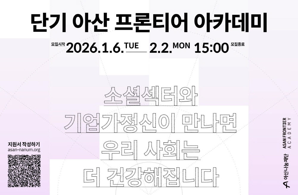 아산나눔재단이 기업가정신을 갖춘 차세대 사회혁신 리더 양성을 위해 ‘단기 아산 프론티어 아카데미’ 수강생을 모집한다. 기존 7개월 정규 과정을 5일 코스로 압축한 이 프로그램은 올해부터 경기∙인천 등 서울 외 지역 기반 비영리 및 영리 종사자를 대상으로 선발을 확대해 총 42명에게 교육을 무료 제공한다. 교육은 2월 24일부터 28일까지 온∙오프라인으로 진행되며, 특히 부산에서 2박 3일간 워크숍을 통해 비영리 조직 전략, 리더십, 임팩트 경영 등 사회혁신 생태계에 대해 집중 학습할 예정이다. 지원은 내달 2일까지 아산나눔재단 공식 홈페이지에서 가능하며, 최종 선발 명단은 2월 10일에 발표된다.