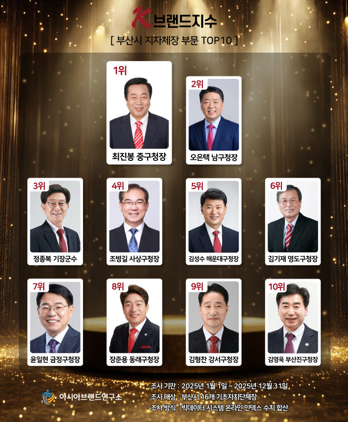 아시아브랜드연구소는 ‘K-브랜드지수’ 2025년 연간 집계 결과, 최진봉 중구청장이 부산시 지자체장 부문 1위에 선정됐다고 7일 발표했다. 이번 지수는 부산시 16개 기초자치단체장을 대상으로 2025년 1월부터 12월까지 온라인 빅데이터 9007만여 건을 분석해 산출됐다. 연구소는 이번 결과가 ‘행정 성과의 크기’보다 ‘구민 소통의 능력’이 주요 키워드로 부상했음을 보여준다고 평가했다. 최진봉 중구청장의 1위 등극은 도시 규모나 예산과 무관하게 실질적인 정책 추진과 생활환경 개선 효과가 반영된 사례로 분석됐다. 오은택 남구청장(2위), 정종복 기장군수(3위) 등이 뒤를 이으며 TOP10에 올랐다. 이는 부산 지역 지자체장 브랜드 경쟁력이 이제 ‘성과 발표’보다 시민들의 ‘생활 변화’에 더 민감하게 반응하는 흐름을 보여주는 것으로 해석된다.