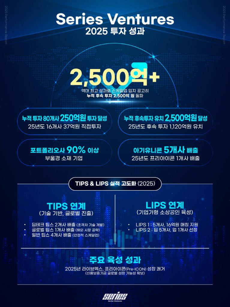 시리즈벤처스가 2025년 포트폴리오사의 누적 후속 투자액이 2,500억 원을 돌파하며 역대 최고 성과를 달성했다고 밝혔다. 이는 2025년 한 해 동안에만 총 1,120억 원 규모의 후속 투자를 유치하며 초기 스타트업들의 성공적 성장 궤도 진입을 공고히 한 결과다. 현재까지 약 80개 기업에 250억 원을 직접 투자한 시리즈벤처스는 라이브엑스를 신용보증기금의 ‘프리아이콘’으로 선정시키고 아기유니콘 5개사를 배출했다. 딥테크·글로벌 팁스 및 LIPS 연계 등 정부 지원 사업을 통해 기술 기반 스타트업의 질적 성장을 지속적으로 견인하고 있다.