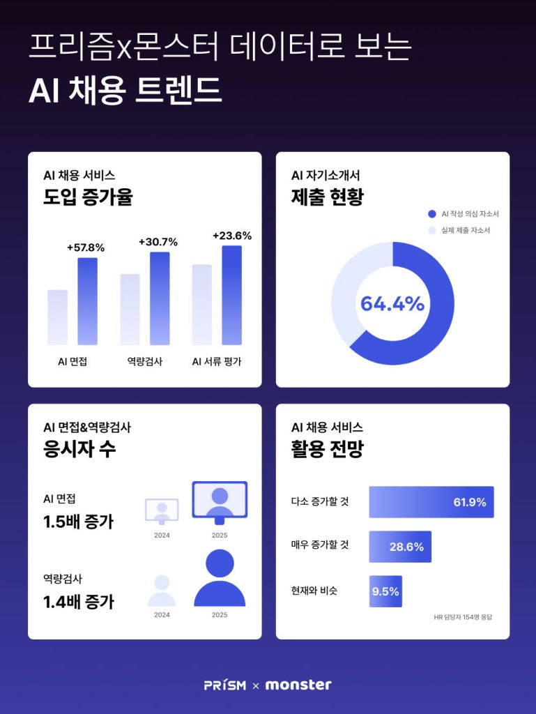 자연어 이해 실용 AI 기업 무하유는 ‘2026 AI 채용 트렌드 리포트’를 통해 2025년 AI 채용 솔루션 도입 현황을 공개했다. AI 면접 솔루션인 ‘몬스터’ 도입 고객사는 전년 대비 57.8% 증가했으며, AI 서류 분석 서비스 ‘프리즘’ 고객사도 23.6% 늘어 채용 시장 내 AI 활용이 확대되고 있음을 확인했다. 특히 2025년 채용에 제출된 자기소개서 10건 중 6건 이상이 AI로 작성된 것으로 나타나, AI가 채용 과정 전반에 걸쳐 활용되며 기업의 채용 업무 효율화와 AX(AI 전환)를 가속화하고 있는 것으로 분석됐다. 무하유의 솔루션은 현재 700개 이상의 고객사에서 활발히 활용 중이다.