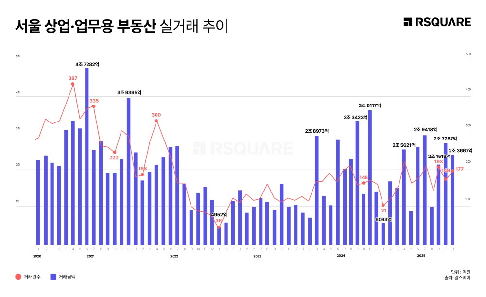 상업용 부동산 종합 서비스 기업 알스퀘어 RA(알스퀘어 애널리틱스)가 국토교통부 실거래가 자료를 분석한 결과, 2025년 11월 서울 상업·업무용 부동산 거래 시장에서 호텔 자산의 존재감이 두드러진 것으로 나타났다. 거래 규모 상위 3건 중 2건이 호텔 자산으로 확인되었으며, 이 가운데 태광1호 리츠가 약 2,542억 원에 인수한 중구 ‘코트야드 바이 메리어트 서울 남대문 호텔’이 최대 거래를 기록했다. 11월 전체 거래 규모는 2조 3,667억 원으로 전월 대비 13.2% 줄었으나, 거래 건수는 18.8% 증가하며 중소·중형급 거래를 중심으로 시장 저변이 확대되는 양상이다. RA는 이 같은 대형 딜의 변화와 거래 건수 증가를 들어 시장 회복 흐름이 중기적 추세로 이어지고 있다고 분석했다.
