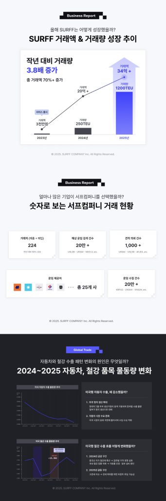 해상 운임 솔루션 기업 서프컴퍼니가 2025년 연간 총 거래액 34억 원을 기록하며 전년 대비 70%의 성장세를 보였다. 특히 총 물동량은 1,200 TEU로 3.8배 이상 급증했다. 이는 자체 해상 물류 데이터베이스를 활용해 ‘고객사별 맞춤형 운임’을 제공한 전략이 주효했다는 분석이다. 실제 이용 기업 고객 수는 56% 증가했으며, 해상 운임 검색 건수는 20만 건을 상회했다. 서프컴퍼니는 2026년 데이터 솔루션 매출 비중을 높이고 창고 등 물류 자산에 대한 직접 투자를 확대, 시리즈A 유치를 통해 온·오프라인을 아우르는 통합 공급망 서비스를 구축할 방침이다.