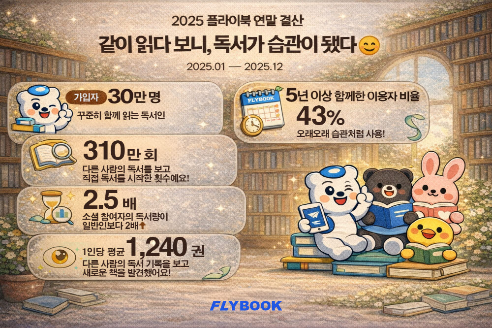 소셜 리딩 플랫폼 플라이북이 2025년 한 해 동안의 이용 데이터를 분석한 연말결산을 공개했다. 이번 결산은 독서가 개인의 의지보다 환경에 의해 습관으로 자리 잡을 수 있음을 보여준다. 누적 가입자는 30만 명을 돌파했으며, 전체 이용자 중 43%가 5년 이상 서비스를 사용한 것으로 나타났다. 스마트폰 앱 특성상 단기 이용자가 많은 점을 고려하면 이례적인 수치다. 플라이북은 장기 이용의 배경으로 ‘함께 읽는 경험’을 꼽았다. 실제로 지난해 다른 사람의 독서 기록을 보고 독서를 시작한 횟수는 310만 회에 달했고, 이용자들은 평균적으로 1년 동안 1,240번 타인의 기록을 접했다. 이 과정에서 새로운 책을 발견하고 독서량이 일반 성인 대비 2.5배 이상으로 늘어난 것으로 집계됐다. 특히 한국소설·에세이·문학 장르가 전체 독서의 62%를 차지하며, 《급류》, 《소년이 온다》, 《모순》, 《혼모노》, 《채식주의자》 등이 가장 많이 읽힌 작품으로 기록됐다. 플라이북은 경쟁이나 랭킹 없이도 독서가 자연스럽게 습관화되는 구조를 만들어냈다는 점에서, 운동·금융 분야의 ‘습관형 서비스’가 독서 영역에서도 유효함을 입증한 사례로 평가된다.