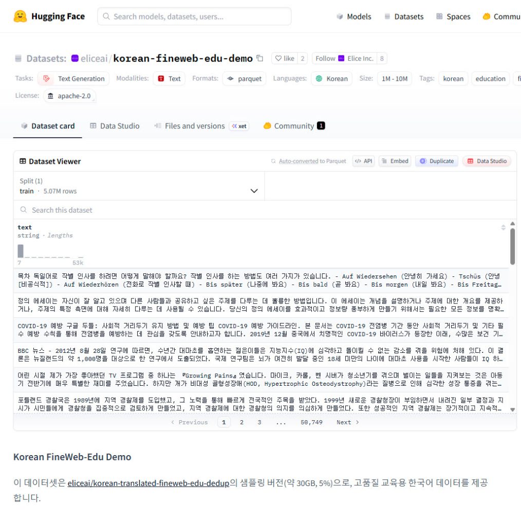 AI 풀스택 기업 엘리스그룹(대표 김재원)이 한국어 AI 연구 및 개발 활성화를 위해 고품질 한국어 AI 교육용 데이터셋 2종을 글로벌 오픈소스 플랫폼 ‘허깅페이스’에 공개했다. 이 데이터셋은 학술 및 교육 도메인에서 거대 언어 모델(LLM)의 한국어 성능을 강화하도록 설계됐다. 특히, 핵심 데이터셋인 ‘한국어 파인웹 교육 데이터셋 데모’의 원본은 1,900억 토큰 규모에 달해, 오픈소스로 공개된 한국어 고품질 데이터셋 중 최대 규모를 자랑한다. 엘리스그룹은 이번 공개로 한국어 AI 연구 환경 진입 장벽을 낮추고, 교육·연구 분야의 LLM 학습 지원을 가속화할 계획이라고 밝혔다.