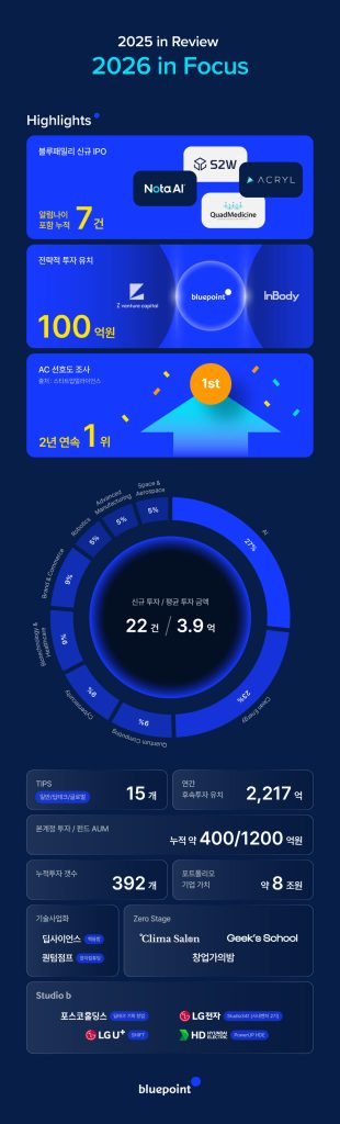 딥테크 액셀러레이터 블루포인트파트너스가 지난해 AI 27%, 클린에너지 23% 등 미래 핵심 산업 분야 22개 스타트업에 신규 투자를 집행하며 초기 스타트업 생태계의 구심점 역할을 이어갔다. 누적 투자 스타트업은 392개로 증가했으며, 포트폴리오 기업들은 총 2,217억원의 후속 투자를 유치하는 성과를 냈다. S2W, 노타 AI 등 4개 기업이 IPO에 성공해 누적 7건의 IPO 기록을 달성했다. 또한 제트벤처캐피탈, 인바디로부터 100억원 규모의 전략적 투자를 유치하며 딥테크 투자 역량을 강화했다.