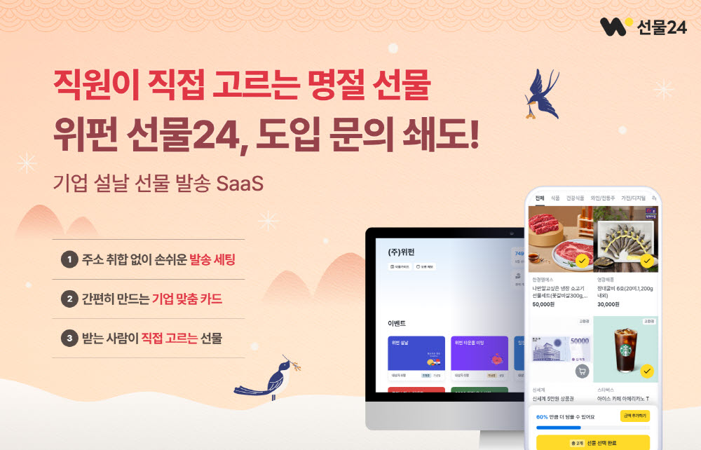 BaaS 플랫폼 기업 위펀이 기업 전용 선물 SaaS ‘선물24’의 2026년 설 명절 얼리버드 서비스를 오픈했다. 서비스는 HR 및 인사, 총무 부서를 중심으로 기업 고객 문의가 빠르게 증가하며 호응을 얻고 있다. 선물24는 기업이 예산과 대상자를 설정하면 임직원이 원하는 선물을 직접 선택하고, 배송 및 정산까지 전 과정이 자동으로 처리되는 원스톱 솔루션이다. 이는 명절 선물 준비에 따르는 담당자의 수작업 부담을 획기적으로 줄여 업무 효율을 높이는 한편, 임직원의 선물 만족도를 동시에 개선하는 새로운 명절 선물 관리 시스템으로 자리매김하고 있다.