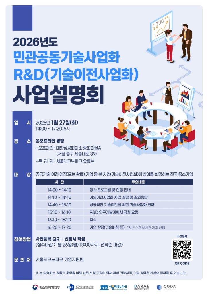 서울테크노파크가 중소벤처기업부의 ‘2026년 민관공동기술사업화R&D 사업설명회’를 1월 27일 대한상공회의소와 유튜브를 통해 온·오프라인 동시 개최한다. 공공기술 이전을 계획하는 전국 중소기업의 사업 이해도를 높이는 것이 목표다. 설명회는 사업 안내, 질의응답(Q\&A)과 함께 성공적인 기술사업화 전략 및 R\&D 계획서 작성 요령 등 전문가 특강으로 진행된다. 특히 설명회 종료 후에는 기술매칭 상담 부스를 별도로 운영해 기업의 애로사항을 현장에서 밀착 지원할 예정이다. 서울테크노파크 컨소시엄은 R\&D-실증-사업화까지 전주기 기술사업화 성공모델 실현을 목표로 중소기업의 기술경쟁력 강화를 지원할 방침이다.