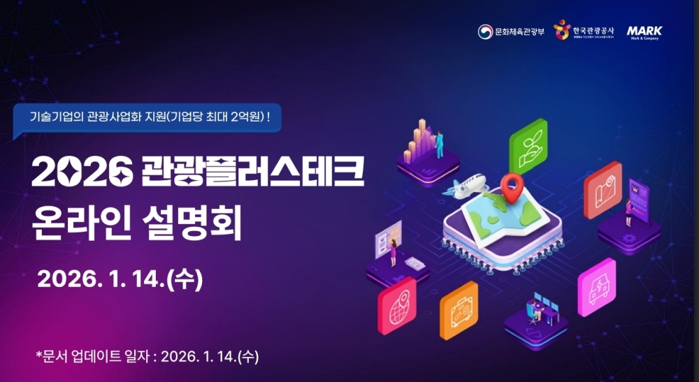문화체육관광부와 한국관광공사가 주관하는 ‘2026 관광플러스테크’ 프로그램이 이달 26일 오전 11시까지 참여 기업을 모집한다. 본 사업은 우수한 기술력을 보유한 기업이 관광 분야로 사업을 확장하고 새로운 시장을 창출하도록 돕는 관광사업화 지원 프로그램이다. 모집 대상은 국가 연구개발(R\&D) 사업 실적을 보유한 중소기업으로, 심사를 거쳐 최대 7개사를 최종 선정한다. 선정 기업에는 연 최대 2억 원의 사업화 자금과 함께 비즈니스 모델(BM) 컨설팅, 오픈이노베이션 등 전문 프로그램 지원이 제공된다. 신청은 투어라즈를 통해 접수할 수 있다.