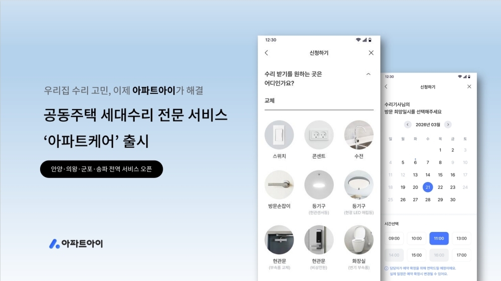 아파트 생활 지원 플랫폼 아파트아이가 입주민들의 집 수리 고민을 해소할 ‘아파트케어’ 서비스를 안양, 의왕, 군포, 송파 4개 지역 아파트로 확대 출시했다. 입주민들은 사설 업체를 일일이 찾거나 가격을 비교할 필요 없이, 검증된 전문가의 신뢰성 높은 수리 서비스를 합리적인 가격에 이용할 수 있게 되었다. 특히 아파트 구조에 정통한 공동주택 관리 전문가를 투입하며, 철저한 신원 확인과 전문 교육을 이수한 엔지니어만 현장에 배치해 여성 1인 가구 또는 고령자 가구도 안심하고 서비스를 이용할 수 있도록 했다. LED 전등 교체, 문고리 수리 등 생활 속 작은 고장도 앱을 통해 간편하게 신청할 수 있으며, 현장 추가 요금이 없는 정찰제를 도입하여 가격 투명성을 확보했다. 아파트아이는 이번 서비스 확대를 통해 관리비 결제 플랫폼을 넘어 주거 생활 전반을 아우르는 ‘토탈 홈케어 플랫폼’으로 도약한다는 계획이다.