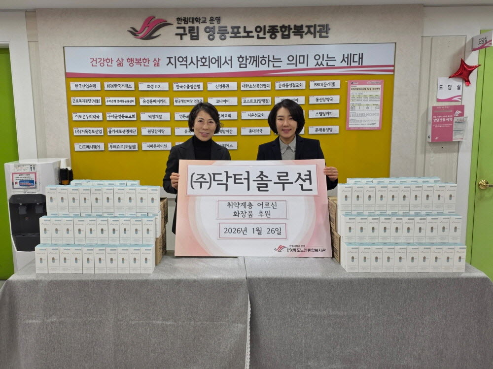 글로벌 비건 뷰티 기업 닥터솔루션이 서울 영등포노인종합복지관에 2,700만원 상당의 피부 진정·보습용 의료기기 ‘앤닥터 카밍 젤크림 MD’ 300개를 기부했다고 26일 밝혔다. 이번 기증품은 식약처 인증을 받은 제품으로, 겨울철 복지관을 이용하는 어르신들의 피부 관리에 활용될 예정이다. 닥터솔루션은 ESG 경영 실천의 일환으로 2021년부터 현재까지 총 14회에 걸쳐 약 1억 3,400만원 규모의 기부를 지속해왔으며, 올해도 추가적인 사회공헌 활동을 이어갈 계획이다. 오다정 대표는 “이웃과 동행하며 사회와 동반성장을 지향하겠다”고 전했으며, 닥터솔루션은 이러한 사회공헌 활동을 인정받아 2024년 K-ESG 경영대상 등을 수상했다.