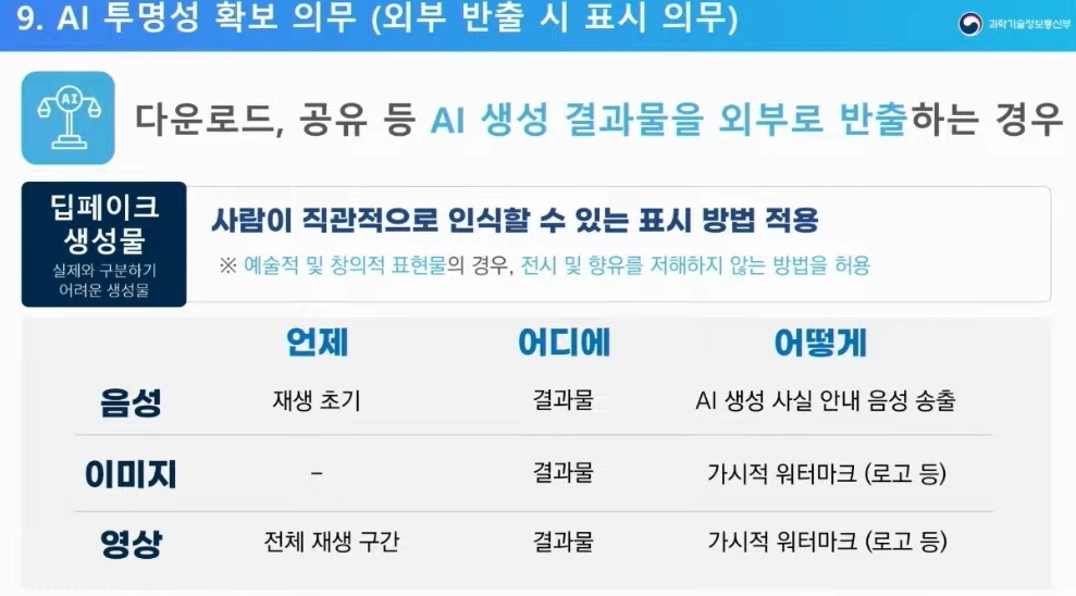 딥테이크 AI 생성 결과물을 반출할 경우 사람이 직관적으로 판단할 수 있도록 알려야된다. 다만 예술이나 창의적 표현물일 경우 예외가 적용된다.음성은 재생초기에 AI 생성 사실 안내 음성 송출, 이미지는 워터마크, 영상에는 전체 재생 구간에 워터마크 등을 포함해야한다.