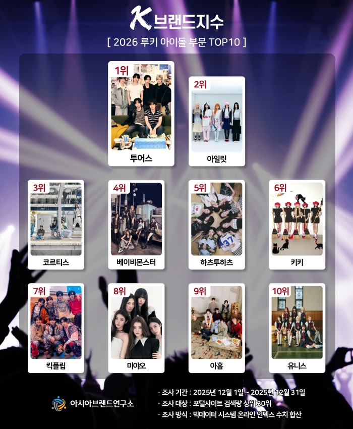 빅데이터 평가 기관 아시아브랜드연구소는 29일 ‘K-브랜드지수’ 2026년 루키 아이돌 부문에서 그룹 투어스가 1위를 차지했다고 발표했다. 2위는 아일릿, 3위는 코르티스가 뒤를 이었다. 투어스는 대중적인 음악과 청량한 콘셉트로 빅데이터상에서 긍정적인 반응을 얻었으며, 아일릿 역시 독보적인 스타일과 강력한 팬덤으로 높은 순위를 기록했다. 특히 코르티스의 가파른 상승세와 하츠투하츠, 킥플립 등 뉴페이스의 TOP10 진입은 루키 아이돌 성공 공식이 기존의 방송 노출을 넘어 틱톡, 릴스 등 숏폼 플랫폼의 화제성과 글로벌 팬덤의 결집력에 의해 좌우되고 있음을 보여준다. 이번 순위에는 팬덤 투표 기반의 ‘스타덤 인덱스’가 공식 반영되었다.
