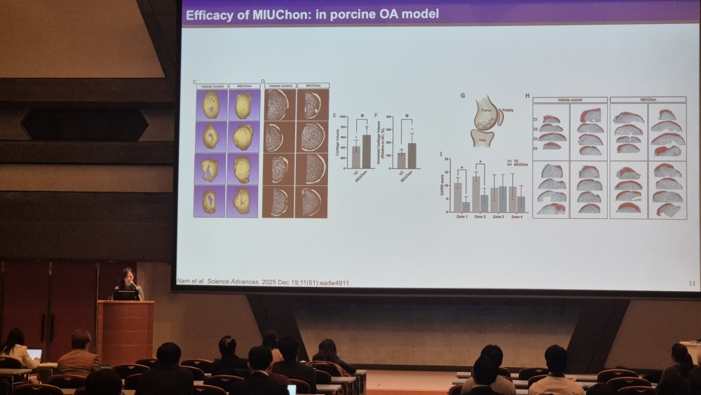 유도만능줄기세포(iPSC) 연구 기업 입셀과 가톨릭대학교 공동연구진이 세계 최고 권위의 키스톤 국제학회에서 iPSC 유래 연골세포치료제 ‘MIUChon’의 임상 연구 성과를 공식 발표했다. 가톨릭대 임예리 교수는 일본 교토에서 열린 학회에서 MIUChon의 개발 배경, 임상 설계, 안전성 및 유효성 평가 결과를 종합적으로 소개해 국제 학계의 주목을 받았다. MIUChon은 iPSC에서 분화된 연골세포를 3차원 구형 세포 집합체 형태로 제조한 주사형 치료제로, 연골 손상 부위의 구조적 재생을 목표로 한다. 연구팀은 이번 국제 학술대회 발표를 통해 iPSC 기술의 임상적 적용 가능성을 입증하며 글로벌 연구 협력 및 국제 임상 확대를 본격적으로 추진할 계획이라고 밝혔다.
