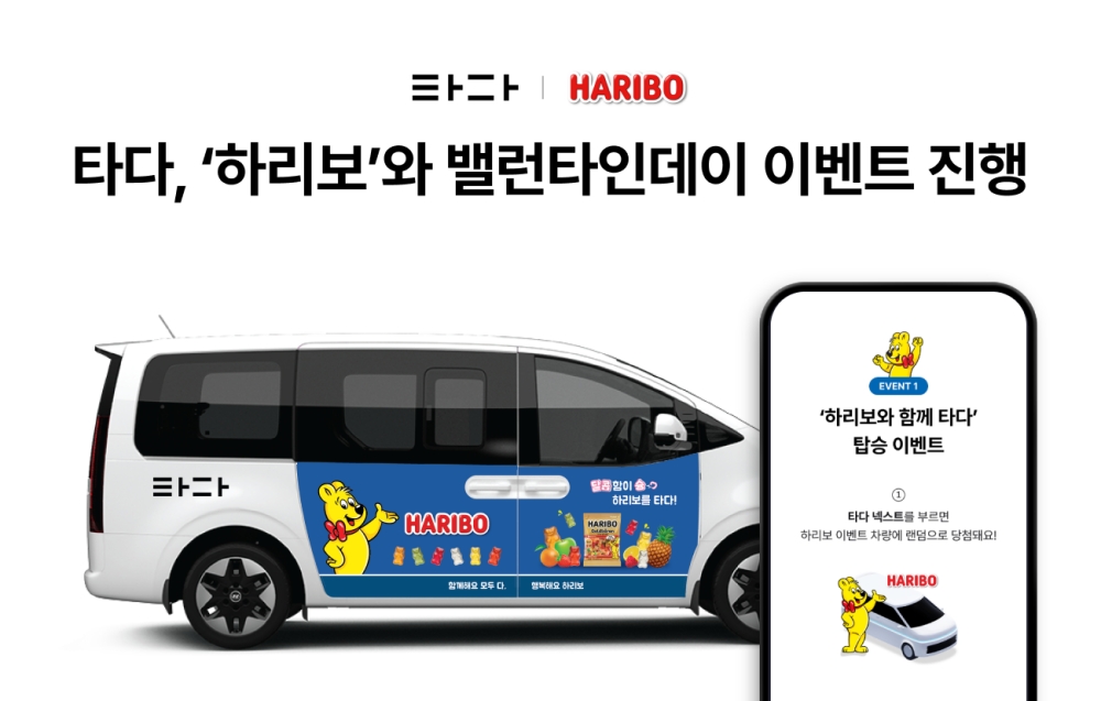 모빌리티 플랫폼 타다(VCNC)가 글로벌 젤리 브랜드 하리보(HARIBO)와 함께 밸런타인데이를 기념하는 체험형 이벤트를 진행한다. 2월 1일부터 화이트데이 시즌인 3월 15일까지 운영되는 이번 협업은 일상적인 이동의 순간을 특별한 브랜드 경험으로 전환하기 위해 기획됐다. 이벤트 기간 내 하리보 특별 차량에 탑승하는 고객에게는 하리보의 대표 제품 ‘골드베렌’과 시즌 젤리 ‘스위트러브’ 2종이 제공된다. 또한, 차량 내부에는 하리보 마스코트인 골드베어 인형이 배치되어 탑승객들에게 즐거움을 선사한다. 타다 관계자는 “다양한 브랜드와의 협업을 통해 모빌리티를 경험의 공간으로 확장해 나갈 것”이라고 밝혔다. 친구를 태그하는 SNS 이벤트 참여자에게는 추첨을 통해 하리보 골드베어 인형과 타다 할인 쿠폰이 증정된다.
