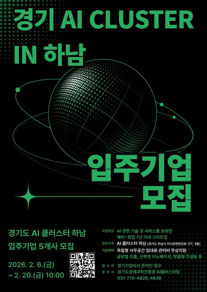 경기도가 하남 지역에 조성 중인 AI 혁신클러스터에 입주할 기업을 모집한다. 신청 기간은 2026년 2월 6일부터 20일 오전 10시까지이며, 인공지능 기반 기술·서비스를 보유한 예비 창업자와 창업 7년 이내 스타트업이 대상이다. 신산업 창업 분야에 해당할 경우 창업 10년 이내 기업도 지원할 수 있다. 모집 규모는 4인실 3개사, 6인실 2개사 등 총 5개사 내외이며, GPU 활용 역량을 갖춘 기업이 우대된다. 선정 기업은 최대 3년간 입주할 수 있으며, 사무공간과 기본 가구, 공용시설, AI 기술 협업 프로그램, 글로벌 진출 지원 등 다양한 혜택을 제공받는다. 특히 하남 클러스터 내에서는 H100·RTX4090급 GPU 인프라를 활용할 수 있다. 신청은 경기기업비서 온라인 시스템을 통해 접수하며, 평가위원회 심사를 거쳐 60점 이상 고득점 순으로 최종 입주 기업이 결정된다.