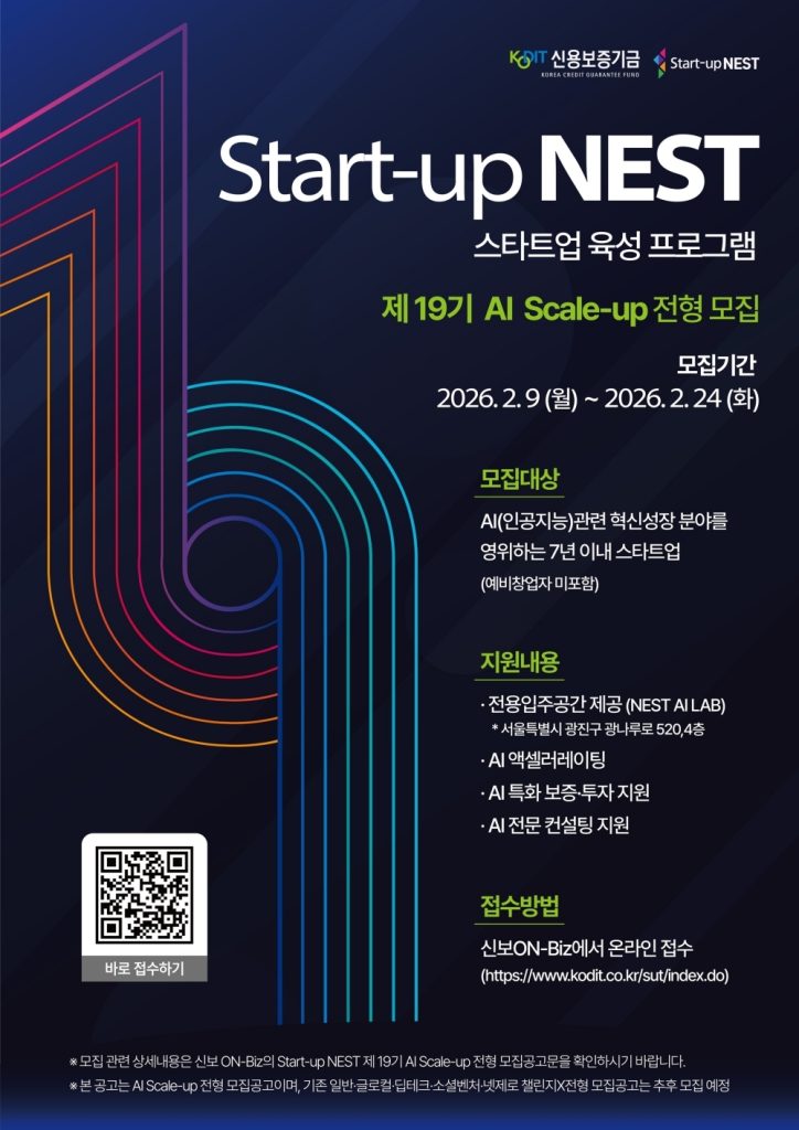 신용보증기금은 인공지능(AI) 분야 혁신 스타트업을 육성하는 대표 프로그램 ‘스타트업 네스트(Start-up NEST)’ 제19기 AI 스케일업 전형 참여 기업을 이달 24일까지 공개 모집한다고 밝혔다. 창업 7년 이내의 AI 기술 보유 기업 10개 내외가 선발 대상이다. 선정 기업에는 AI 전문 액셀러레이터와 협력한 체계적인 성장 전략 수립, IR 역량 강화, 컨설팅 등의 액셀러레이팅이 제공된다. 또한, 맞춤형 보증·투자 등 금융 지원은 물론, AI 스타트업 전용 보육 공간인 ‘NEST AI LAB’ 입주 지원, 기술 멘토링, 기술사업화 지원 등 비금융 서비스도 원스톱으로 지원된다. 신보는 이 프로그램을 통해 국내 AI 스타트업이 산업 성장을 이끄는 핵심 기업으로 발돋움할 수 있도록 지원을 집중할 방침이다.