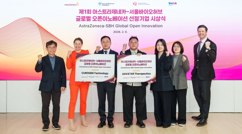 서울바이오허브는 한국아스트라제네카와 공동 진행한 ‘글로벌 오픈이노베이션 프로그램’을 통해 최종 선정된 바이오·의료 스타트업 2곳에 대한 시상식을 지난 9일 개최했다. 국내 유망 바이오텍의 글로벌 스탠다드 조기 도약을 지원하는 이번 프로그램에는 아바타테라퓨틱스(약물 전달 기술)와 큐로젠(R\&I 및 희귀질환 치료)이 최종 선정됐다. 두 기업은 아스트라제네카 글로벌 전문가의 맞춤형 R\&D 멘토링과 서울바이오허브 입주 지원, 3,500만 원의 연구 지원금 등을 받는다. 특히 스웨덴 예테보리 아스트라제네카 바이오벤처허브 입주 기회도 제공된다. 멘토링은 2026년 1월 킥오프 미팅을 시작으로 약 1년간 진행될 예정이다.
