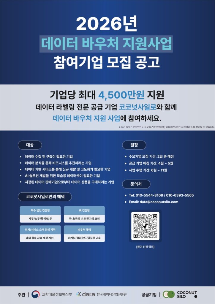 코코넛사일로(주)가 과학기술정보통신부와 한국데이터산업진흥원(K-DATA)이 추진하는 ‘2026년 데이터바우처 지원사업’ 공급기업으로 선정됐다. 이로써 코코넛사일로는 6년 연속 데이터바우처 사업의 공급기업으로 참여하게 됐다. 데이터바우처 지원사업은 중소·중견기업 등이 인공지능(AI) 활용과 데이터 기반 서비스를 도입할 수 있도록 데이터 구매 및 가공 비용을 지원하는 정부 사업이다. 제조, 유통, 물류 등 여러 산업 분야에서 데이터 구축 및 AI 분석 경험을 쌓아온 코코넛사일로는 2026년 사업에서 데이터 정제·가공뿐만 아니라 객체 탐지, 이상 탐지 등 AI 응용 솔루션 구축 지원을 확대할 방침이다. 회사는 다년간 축적한 경험을 바탕으로 사업계획서 작성부터 데이터 구축 및 품질 검수까지 전 과정을 밀착 지원할 계획이다. 한편, 2026년 데이터바우처 지원사업 수요기업 모집 공고는 공식 홈페이지를 통해 추후 안내될 예정이다.