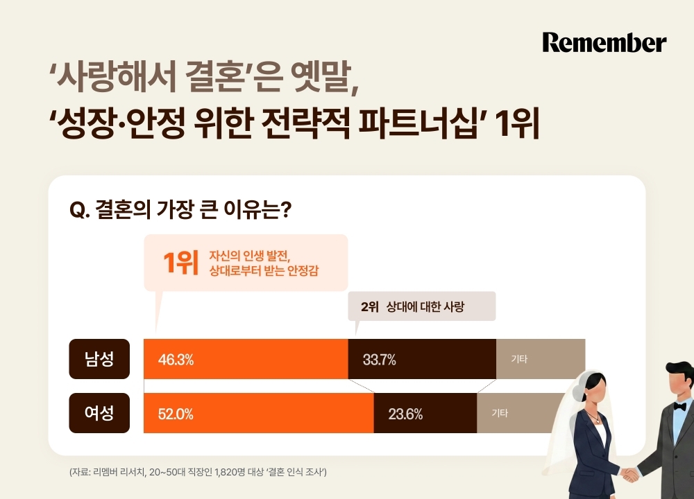 비즈니스 네트워크 서비스 리멤버가 20\~50대 직장인 1,820명을 대상으로 진행한 ‘결혼 인식 조사’ 결과를 발표했다. 조사에 따르면, 대한민국 직장인들의 결혼관이 남녀 간의 사랑의 결실이라는 전통적 관념에서 커리어 성장과 삶의 안정을 위한 ‘전략적 파트너십’으로 재정의되고 있는 것으로 나타났다. 응답자 대다수는 결혼의 가장 큰 이유로 ‘상대로부터 얻는 안정감과 자신의 인생 발전’을 1순위로 꼽았으며, ‘상대를 사랑하기 때문’이라는 응답은 2위로 밀려났다. 다만 20대 남성만이 유일하게 ‘사랑’을 1순위로 선택해 눈길을 끌었다. 한편, 직장인 10명 중 7명이 결혼의 필요성에 긍정적인 반면, 미혼 남녀 모두 결혼을 미루는 주된 이유로 ‘결혼에 따르는 경제적·심리적 책임감’을 지목해 현실적인 어려움을 드러냈다. 이 외에도 미혼 여성은 ‘기대에 맞는 상대를 찾지 못해서’를, 남성은 ‘나 혼자 사는 것이 더 편하고 풍요로워서’를 결혼을 하지 않거나 미루는 이유로 답하며 성별 간 인식 차이가 확인됐다.