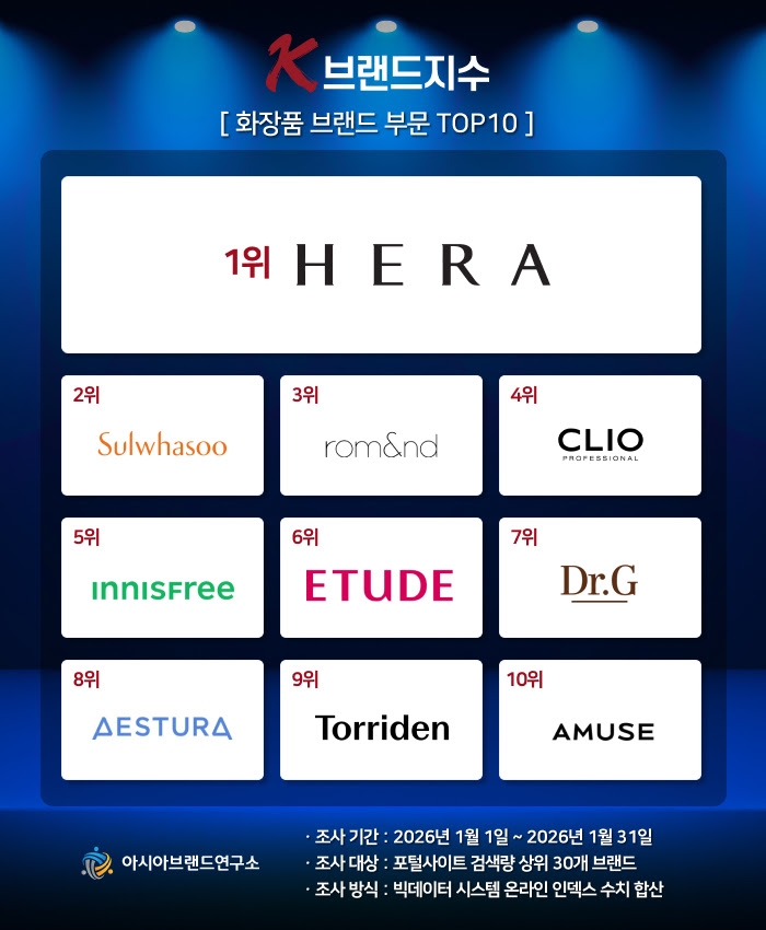 아시아브랜드연구소는 2026년 1월 화장품 브랜드 부문 ‘K-브랜드지수’ 분석 결과를 19일 공개했다. 포털 검색량 상위 30개 브랜드를 대상으로 온라인 빅데이터 910만여 건을 분석한 결과, 헤라가 1위를 수성한 가운데 설화수가 2위로 급등하며 프리미엄 럭셔리 브랜드의 강세가 뚜렷하게 나타났다. 롬앤, 클리오, 이니스프리가 뒤를 이으며 TOP10을 형성했다. 연구소 측은 중하위권에 토리든과 어뮤즈 등 인디·라이징 브랜드가 신규 진입한 점을 주목하며, 이들이 명확한 콘셉트와 디지털 마케팅으로 MZ세대의 지지를 얻어 시장의 주류로 빠르게 편입되고 있다고 평가했다. 해당 지수는 오프라인 수치를 제외한 온라인 인덱스만을 반영한 수치이다.
