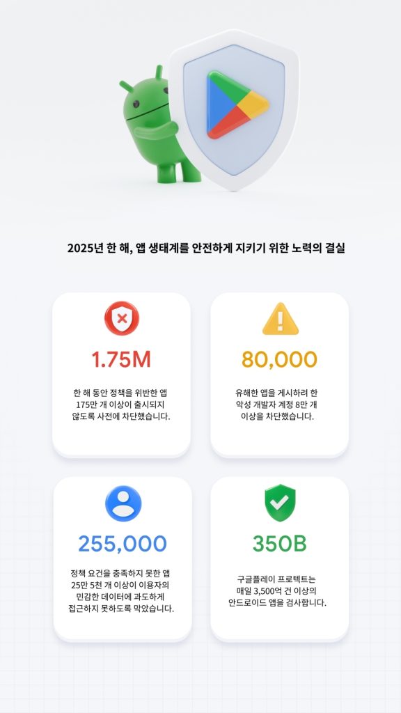 구글이 2025년 구글플레이와 안드로이드 앱 생태계 보안 강화에 대한 성과를 발표했다. 구글은 지난 한 해 AI 기반의 실시간 방어 체계 구축에 집중적으로 투자하고, AI 모델을 앱 검토 프로세스에 도입해 보안 및 보호 정책을 대폭 강화했다. 특히 민감한 데이터 접근을 통제하는 등 사전 차단에 주력한 결과, 175만 개가 넘는 정책 위반 앱과 8만 개 이상의 악성 개발자 계정을 선제적으로 차단하는 성과를 거뒀다. 이는 구글플레이 및 안드로이드 생태계의 신뢰도를 높이는 데 크게 기여했다.