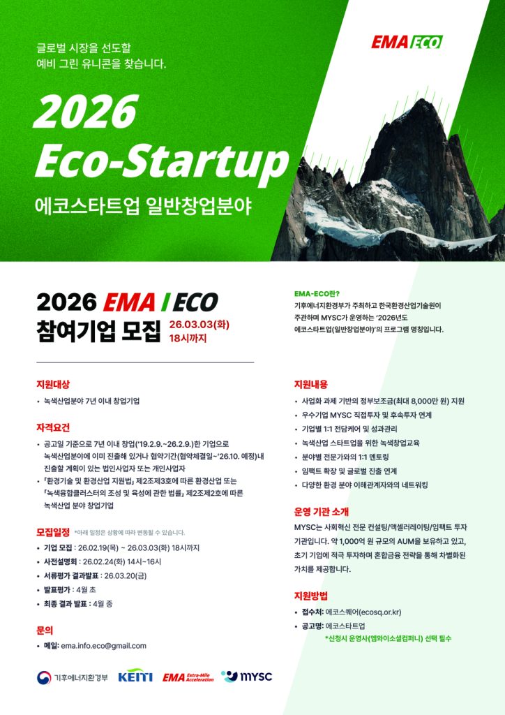 임팩트 액셀러레이터 MYSC가 녹색산업 분야 스타트업의 성장을 가속화하기 위한 액셀러레이팅 프로그램인 ‘2026 에코스타트업(EMA-ECO)’ 참여 기업 모집을 시작했다. 기후에너지환경부가 주최하고 한국환경산업기술원이 주관하며 MYSC가 운영하는 EMA-ECO는 변화하는 기술 및 시장 환경에 대응하여 녹색산업 스타트업의 사업화와 성장을 체계적으로 지원하는 데 초점을 맞춘다. 선발된 기업에는 최대 8,000만 원의 정부지원금이 제공되며, 1:1 맞춤형 멘토링·컨설팅, 특화 창업 교육, 투자 유치 및 글로벌 진출 지원 등의 혜택이 주어진다. 녹색산업 분야에서 창업 7년 이내인 기업이 지원 대상이며, 모집은 3월 3일 18시까지 진행된다. 프로그램 지원 자격 및 세부 일정은 에코스퀘어(ecosq.or.kr)를 통해 확인할 수 있다.