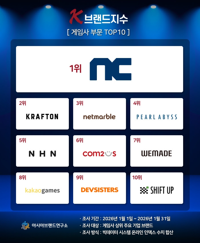 아시아브랜드연구소는 ‘2026년 1월 K-브랜드지수’ 게임사 부문 평가 결과 엔씨소프트가 1위를 차지했다고 23일 발표했다. 엔씨소프트는 연초 신작 모멘텀과 글로벌 IP 확장 기대감에 힘입어 크래프톤(2위), 넷마블(3위) 등 경쟁사를 제치고 선두에 올랐다. TOP10 순위에서는 펄어비스가 4위로 급등하고 데브시스터즈, 시프트업이 새롭게 진입하는 등 역동적인 변화가 관찰됐다. 한정근 아시아브랜드연구소 대표는 이같은 현상에 대해 “대형 MMORPG 위주였던 시장의 관심이 캐주얼, 서브컬처 등 다변화된 장르로 분산되고 있음을 시사하는 유의미한 지각 변동”이라고 평가했다. 이번 조사는 2026년 1월 1일부터 31일까지의 온라인 빅데이터 724만 6677건을 분석한 결과다.