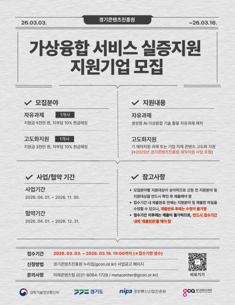 경기콘텐츠진흥원이 가상 융합산업 활성화를 목표로 한 ‘가상 융합 서비스 실증 지원’ 사업 참여 기업을 다음 달 16일까지 모집한다. 모집 분야는 생성형 AI와 가상 융합 기술을 활용한 자유과제와 기존 서비스 성능을 높이는 고도화 지원으로 나뉘며, 각각 1개 기업을 선정해 최대 5천만 원, 3천만 원을 지원한다. 이번 사업은 중·대기업과의 협업을 통한 기술 실증을 핵심으로 하며, 고도화 분야는 지난해 지원 기업도 동일 과제로 재참여할 수 있도록 문턱을 낮췄다. 이는 도내 스타트업이 단발성 지원에 그치지 않고 시장 안착까지 이어질 수 있도록 연속성을 강화한 조치로 평가된다. 지원 대상은 경기도 내에 본사 또는 사업자등록 주소지를 둔 중소기업 및 스타트업이며, 신청은 경콘진 누리집에서 가능하다. 사업은 과기정통부와 경기도, NIPA 등의 지원으로 운영되며, 경콘진은 이번 프로그램을 통해 도내 가상 융합 기업의 성장 기반을 확대하겠다는 방침을 밝혔다.