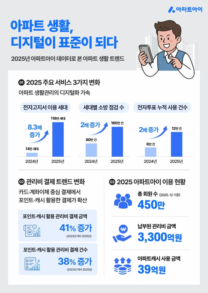 아파트 생활 지원 플랫폼 아파트아이가 2025년 데이터를 바탕으로 ‘아파트 주거 관리 현 트렌드’ 리포트를 발표했다. 아파트 관리가 종이에서 모바일 디지털로 빠르게 전환하는 양상이다. 25년 관리비 전자 고지서 사용 세대는 24년 대비 8배 이상 폭증했으며, 전자투표 및 모바일 점검 참여도 2배 이상 증가했다. 특히 관리비 절감을 위해 포인트나 캐시를 활용한 결제가 확산, 결제 건수와 금액이 전년 대비 40% 이상 증가한 것으로 집계됐다. 아파트아이 총 회원 수는 450만 명을 돌파하며 아파트 관리 앱이 필수 플랫폼으로 자리 잡는 추세다.