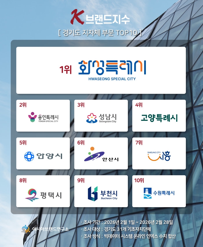 아시아브랜드연구소는 2026년 2월 ‘K-브랜드지수’ 경기도 지자체 부문 평가 결과를 4일 발표했다. 경기도 31개 기초자치단체를 대상으로 온라인 빅데이터 1억 5천만여 건을 분석한 결과, 화성시가 용인시를 제치고 1위에 등극했다. 용인시는 2위, 성남시가 3위를 기록하며 뒤를 이었다. 연구소 측은 화성시가 압도적인 미래 산업 동력을 기반으로 높은 긍정 수치를 얻었다고 분석했다. 도민들의 지자체 브랜드 평가 기준이 단순한 행정 규모에서 실질적인 일자리 창출과 미래 성장성을 체감할 수 있는 ‘경제 활력’ 중심으로 재편되는 신호탄이라고 설명했다. 특히 전통 강호로 불리던 수원시가 10위에 턱걸이한 점이 눈길을 끈다.