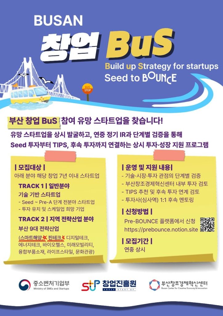 부산창조경제혁신센터가 12일 지역 스타트업의 투자 유치를 돕기 위한 ‘창업BuS 정례 IR’을 센터 4층에서 진행한다. 창업BuS는 유망 기업을 선발해 투자자 앞에서 사업 모델과 기술을 발표할 기회를 제공하는 프로그램으로, Pre-BOUNCE 플랫폼을 통해 신청한 기업 중 성장성이 높은 팀이 이번 행사에 참여한다. 부산창경 투자팀이 직접 기술력과 사업성을 검토하며, 외부 투자사도 함께 참여해 현장에서 투자 가능성을 논의하는 자리가 마련된다. 참가 기업은 자사 기술과 비즈니스 전략을 소개하며 투자 유치와 협력 기회를 모색할 수 있어 지역 스타트업의 자금 조달 통로가 확대될 전망이다. 부산창경은 창업BuS를 기반으로 매주 정례 IR을 운영할 계획이며, 참여 희망 기업은 Pre-BOUNCE 플랫폼 등록 후 상시 신청할 수 있다. 창업BuS는 전국 17개 창조경제혁신센터에서 운영되는 스타트업 발굴·육성 프로그램으로, 멘토링과 투자 연계를 함께 지원하고 있다.